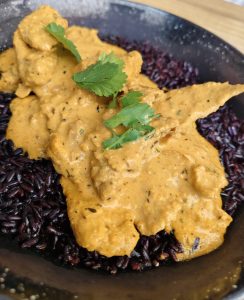 Arroz venere preparado al estilo thai con leche de coco, lima kaffir y carne vegetal bañada en salsa Satay.