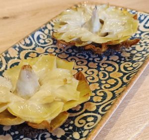 Un tesoro culinario toledano rescatado para convertido en una crema suave y aterciopelada de berenjena que se viste con un manto de jugosos tomates cherry asados al tomillo y romero. Acompañado de nachos, ideales para dipear.